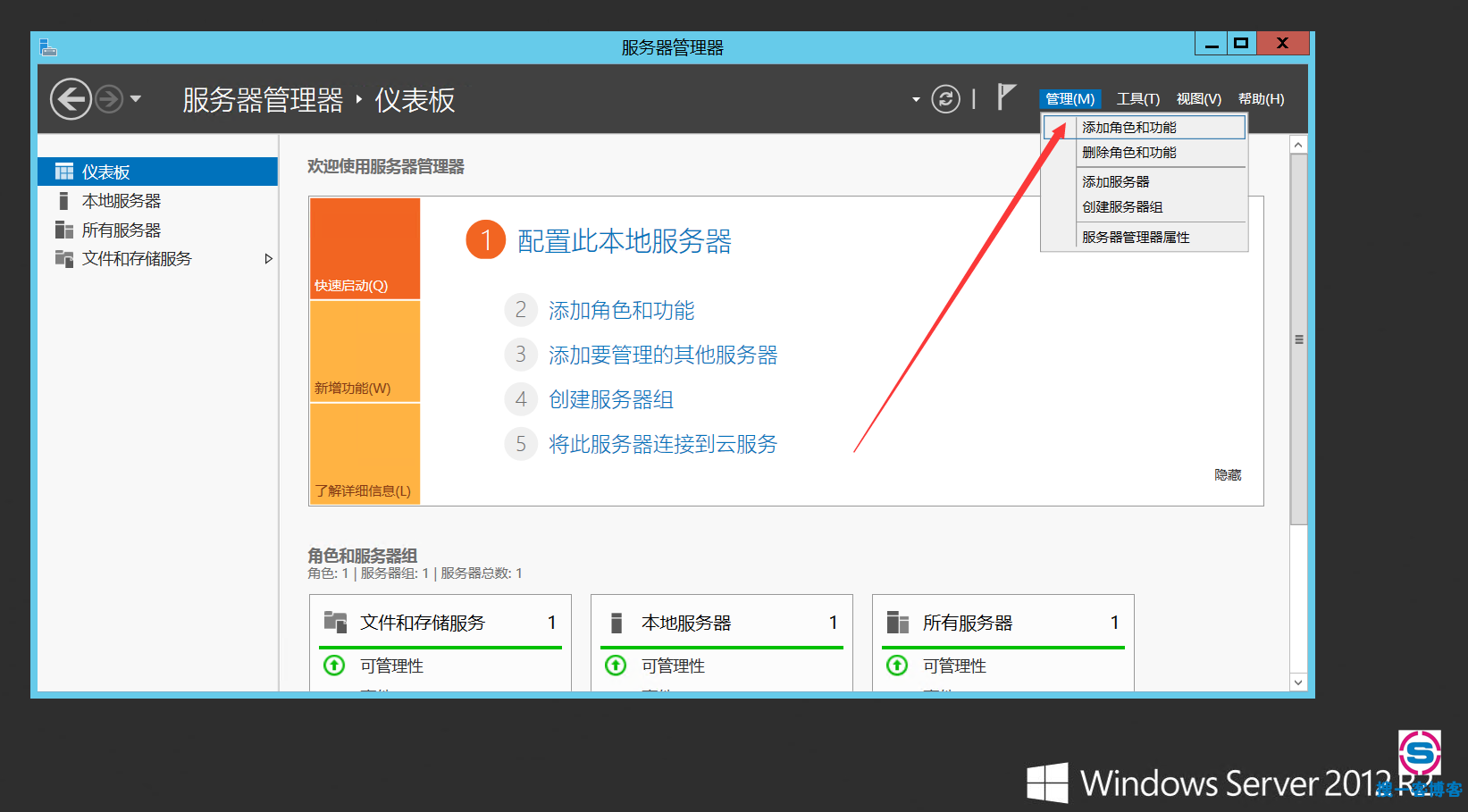 首先,打开 服务器管理器 —— 管理 —— 添加角色和功能