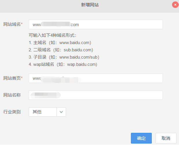 分别填写网站域名、网站名称、网站类型,然后点击【确定】;