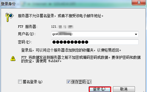 输入FTP用户名和密码:在用户名处输入主机的管理账号,在密码处输入主机的管理密码,如果您的电脑属于您个人使用,您可以选择勾选保存密码,再次登录就无需再次输入密码。(这些信息在自己购买的空间后台都可以找到。相关教程:手把手教你如何购买域名和空间(视频教程))