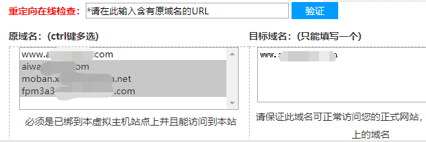 选择“原域名”和“重定向到的目标域名”;
