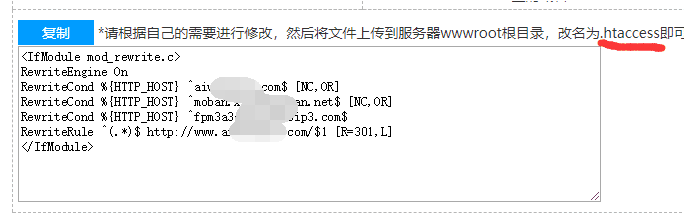 复制生成的301重定向代码。在电脑桌面新建一个“文本文档”,将复制的代码粘贴进去,保存。再将这个“文本文档”重命名为.htaccess;
