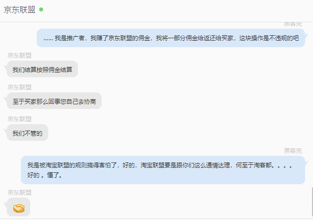 其实相比于淘宝联盟,京东联盟勉强算是后起之秀,虽然商品和佣金都不及淘宝联盟完善,但是在正常上还是略有优势。 淘宝联盟对于返利类的要求可以说是苛刻之极,但是京东联盟就简单的多,通过联盟生成链接并分享,下单获取佣金,用客服的话来说,至于推广者和买家之间有何返利,自行协商,京东联盟并不干预。 由此可见,至少在返利方面,京东联盟还是比较有优势的。