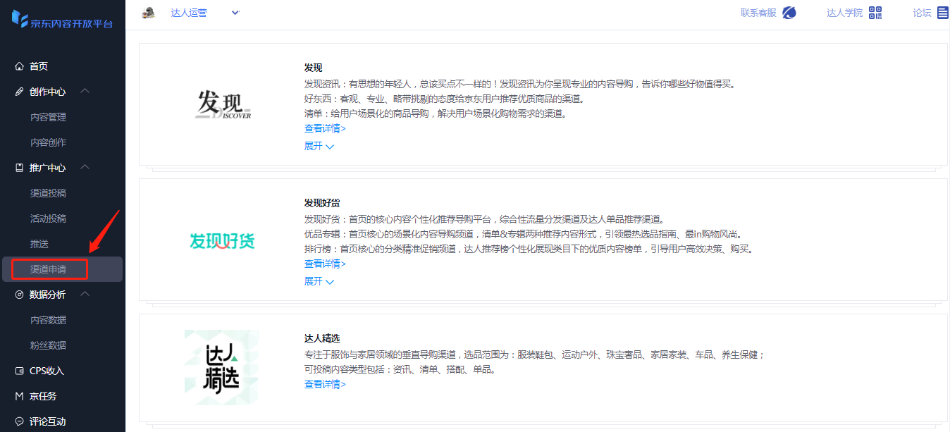 第一步,登录京东内容创作平台,通过【推广中心-->渠道申请】查看全部开放申请入口的渠道信息。
