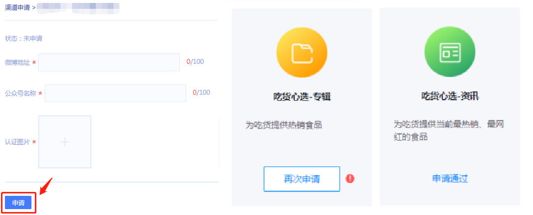 第三步,根据各渠道要求,填写资料申请表(如站外公众号名称、相关后台截图等)。填写完成后点击【申请】提交,此时渠道申请入口变更为“申请中”(一般5-15个工作日);若该渠道不需要审核,则用户直接获得渠道权限,申请入口显示“申请通过”(下图所示)。 此时,达人就可以去内容创作进行投稿啦!