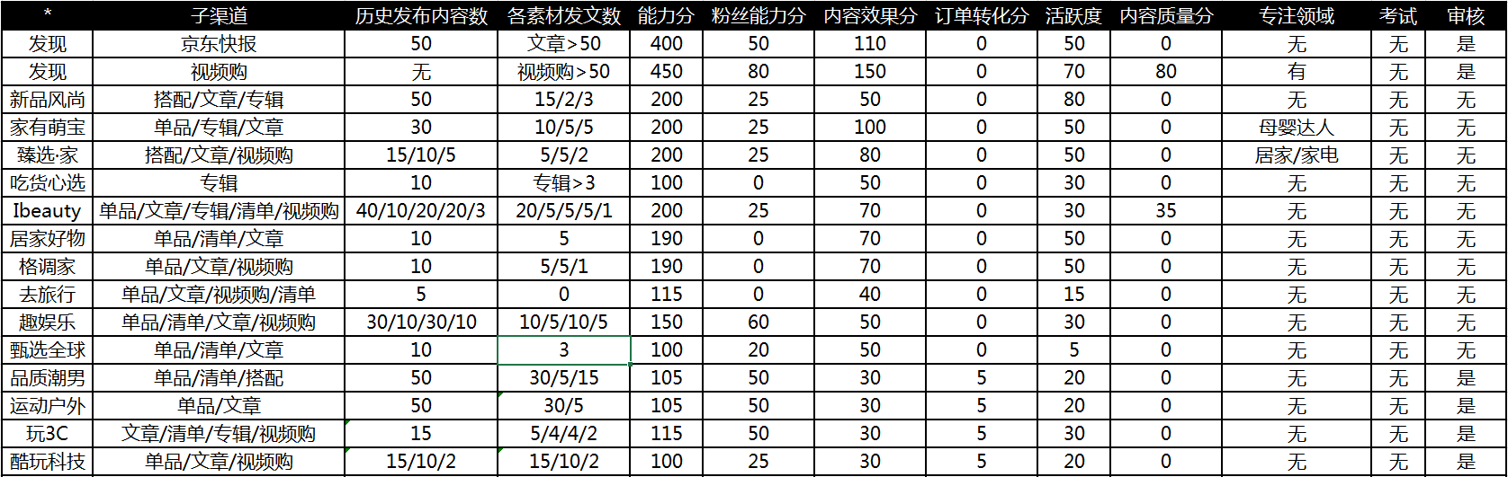 注:表格中“私域发布内容数”和“各素材发文数”分别对应同渠道“子渠道”的素材类型。如,“臻选家”中,申请子渠道“搭配购”的私域内容发布数需大于15篇且搭配购类内容大于5篇;申请子渠道“文章”需私域内容发布数大于10篇且文章类内容大于5篇;申请子渠道“视频”需私域内容发布数大于5篇且京东视频购类内容大于2篇。
