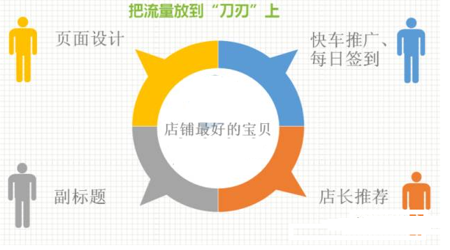 店铺流量渠道少,可以增加快车、每日签到、手机专项价等等加大店铺的流量;集中流量在刀刃上,可以把店铺的流量通过快车、无线互动页、店招、店长推荐等集中在店铺最好的宝贝去。