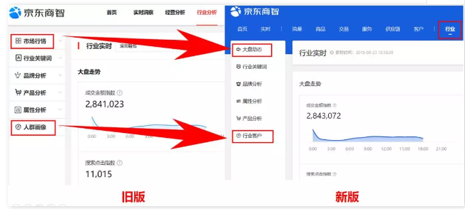“行业分析”下的二级菜单:“市场行情”改名为“大盘动态”、“人群画像”改名为“行业客户”;