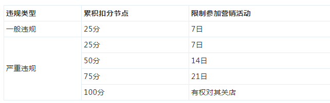 3.1.1商家需遵守《京东开放平台商家违规积分管理规则》中的相关规定,若商家在活动报名时处于处罚期或未通过考试,则不允许活动报名,具体扣分节点如下表所示: