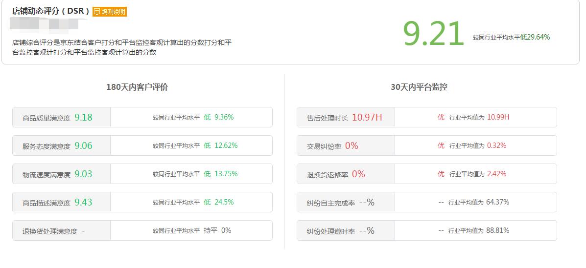 如下图所示,是京东店铺动态评分在店铺后台的具体展现: