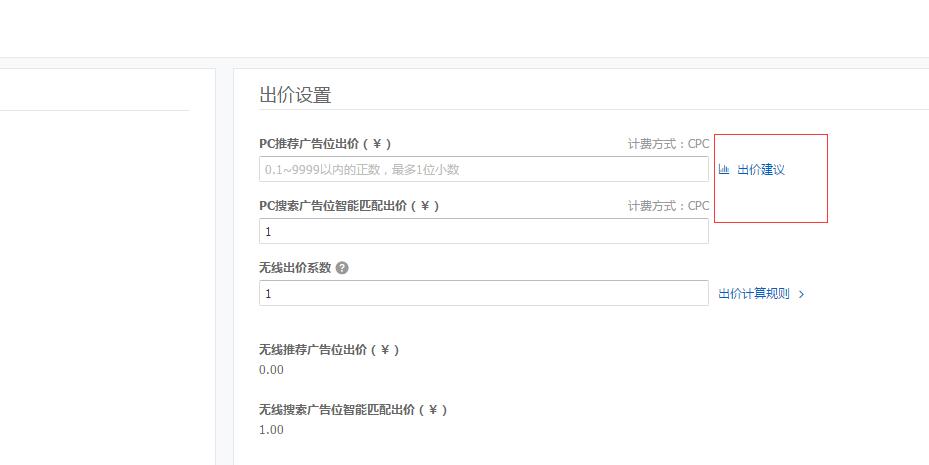 第五步:在这个界面的右侧栏里面有个出价设置,点击出价建议选项,如图所示:
