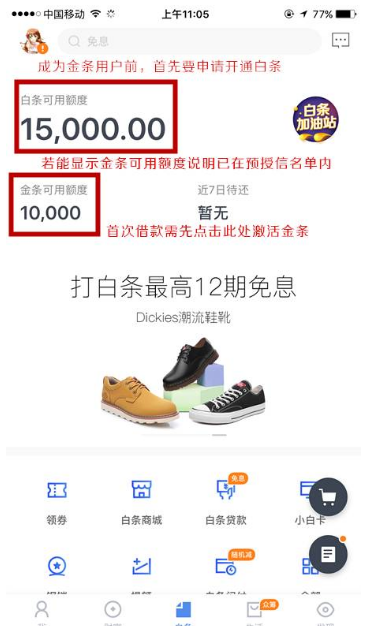 2、若已显示金条可用额度,说明已在预授信名单内,能够申请借款,首次借款需先激活。