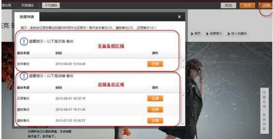 商家可以通过jshop后台的还原功能恢复到京东装修原来的模板。 商家用户在使用店铺模板时,系统会对店铺当前状态创建备份,类型为“店铺备份”。店铺备份只会备份“店铺首页”,“店铺简介页”,“商品列表页”,“店内搜索结果页”4个页面。
