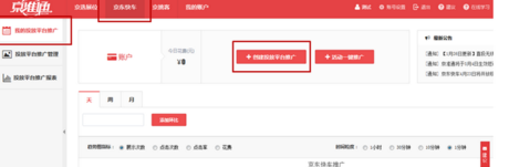 1.路径一:登录进入京准通商家投放平台,系统默认跳转至“京东快车--我的投放平台推广”页面,点击【创建投放平台推广】开始建立推广计划。