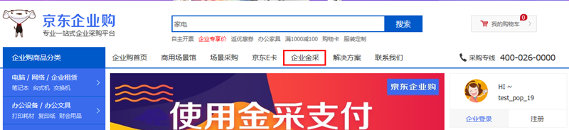 2、填写并核对订单信息完毕后,进入到收银台页面,选择【企业金采】支付。