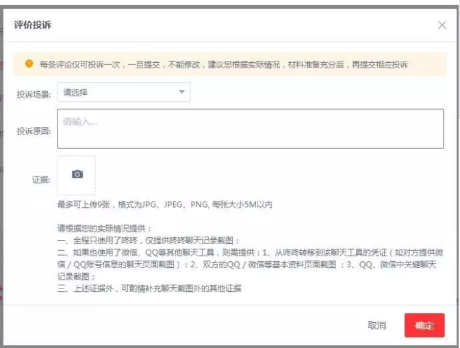 点击“投诉”后,出现以下页面,商家选择投诉场景、填写投诉原因、上传对应证据后,即可提交。