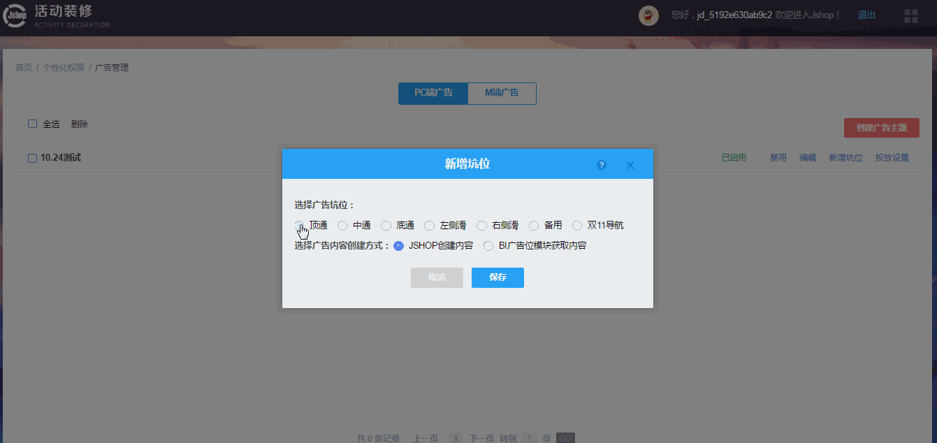 广告内容来源,支持两种方式:jshop创建内容、BI广告位模块获取内容。BI广告位模块获取内容:用户在活动页完成模块设置,在广告位通过输入ID(设置活动ID+模块实例ID)获取广告内容,此功能需申请权限置入BI广告位使用。