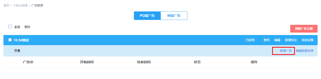 每个广告主题可以创建多个坑位,每个坑位可创建5条内容,根据设置的开始、结束时间自动切换展示。