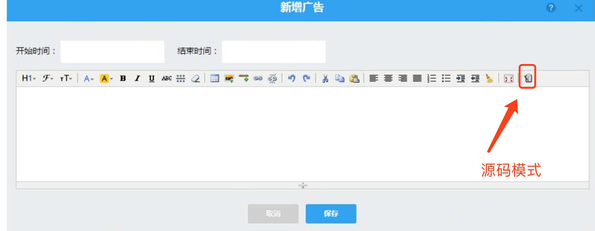 点击“新增广告”,弹出广告内容编辑框,配置广告开始时间和结束时间,录入广告内容
