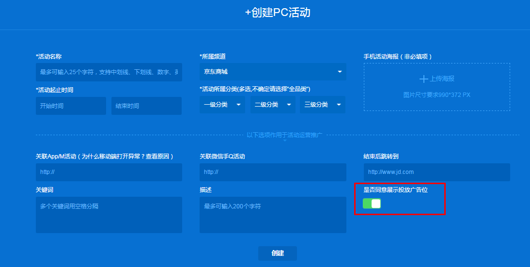 活动关联标识,用户创建活动时勾选“广告位展示”,完成活动标识。