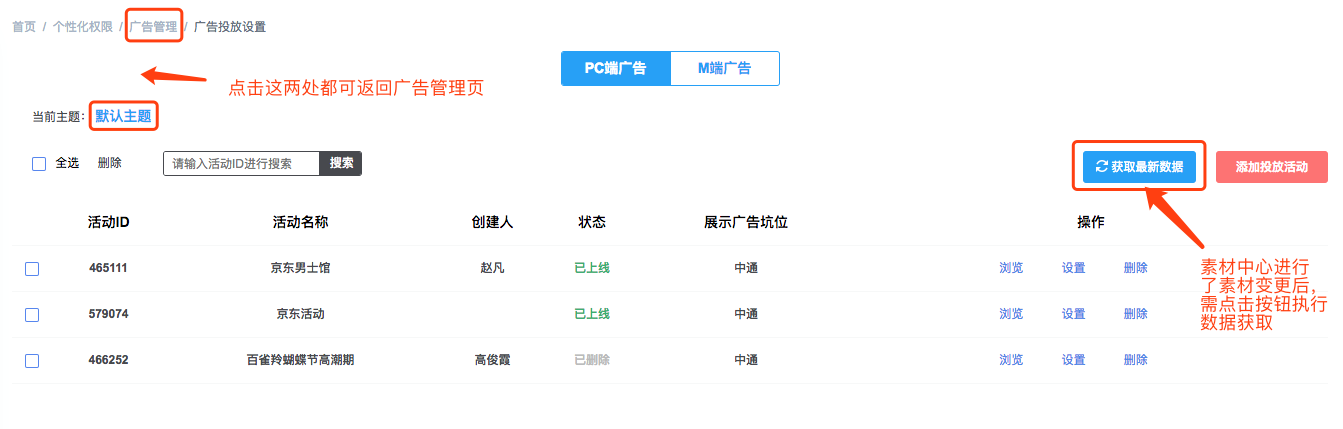 3、 添加投放活动后,例如素材ID或选择自主投放,出现“获取最新数据”按钮,便于用户在素材变更执行手动刷新获取数据