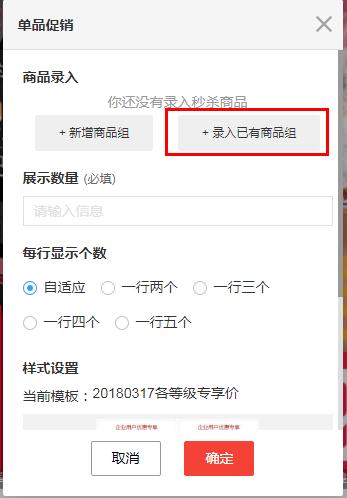 1)无单品促销商品组:点击【新增商品组】,配置商品组,如果还没有单品促销商品需要去商家后台设置。