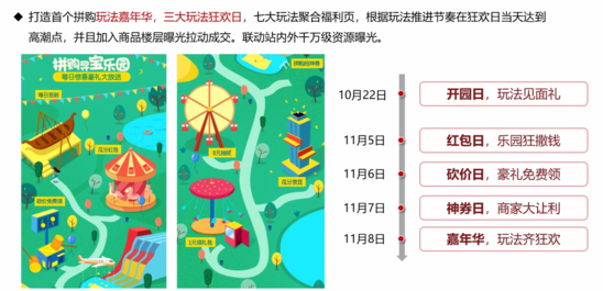 这届双十一期间,京东将推出首个拼购嘉年华,共分为“红包日”、“砍价日”、“神券日”三大玩法狂欢日。本次嘉年华活动联动站内外千万级资源曝光,同时在商品楼层加入了SKU的曝光来帮助商家拉动成交。