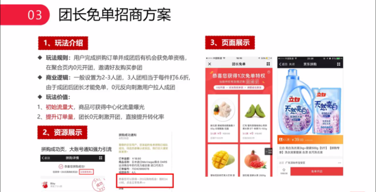 在“团长免单”活动中,用户完成拼购订单后,团长有机会获得免单资格,通常商家设置为2-3人团。该玩法可以让商品获得中心化流量曝光,同时提升订单量。活动时间为10月22日至11月15日。