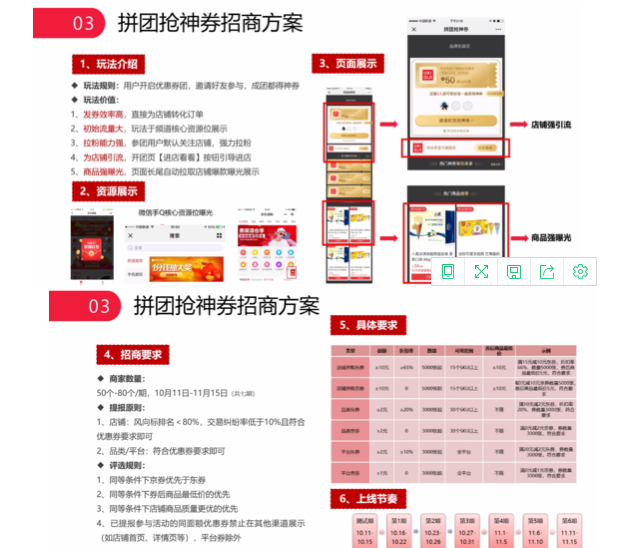 在“拼团抢神券”玩法中,当用户开启优惠券团后,邀请好友参与,成团都可获得优惠券。该玩法使商家发券效率提高,为店铺转化订单,此外还具有增强拉粉能力、为店铺引流、商品强曝光等特点。活动时间为10月11日至11月15日。