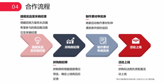商家首先根据招商方案将提商品概况提报至采销经理,拼购侧会根据提报情况进行筛选。收到反馈的商家可以启动制作素材和申请奖券并按时返回,最后由拼购玩法侧负责配置活动上线。