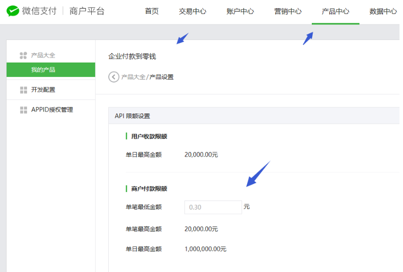 2.设置企业付款到零钱-单笔最低金额:0.3元