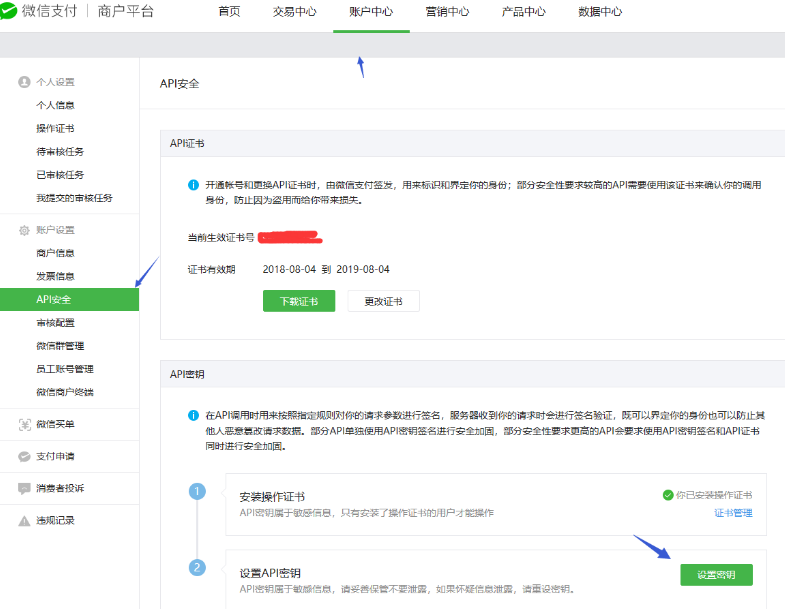 新用户支付没设置支付密钥的我们需要生成一个新支付密钥然后我们登陆微信商户地址:https://pay.weixin.qq.com设置新的密钥。如图下图: