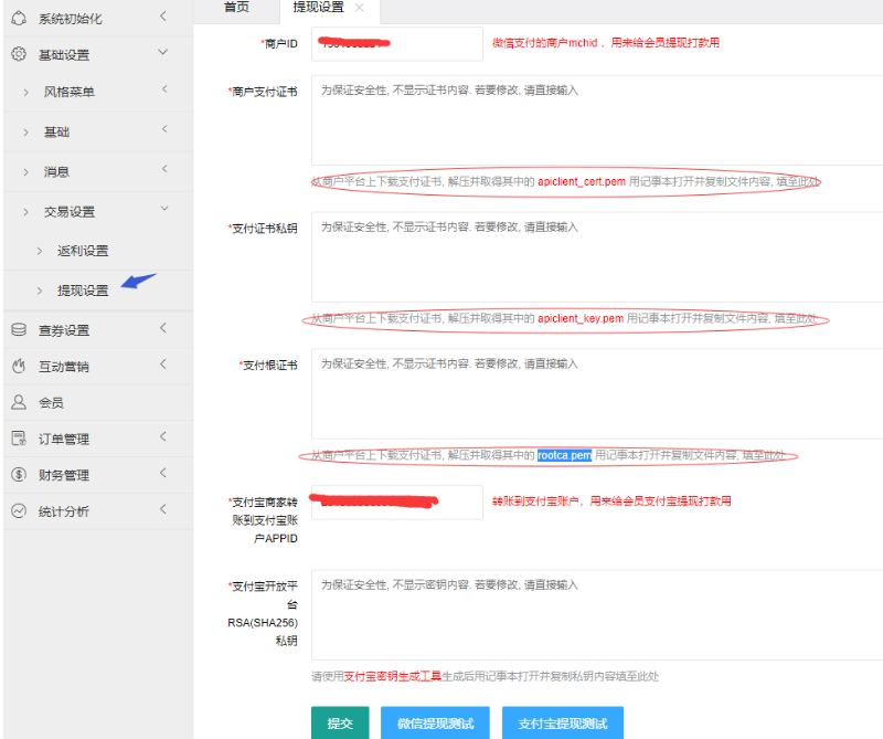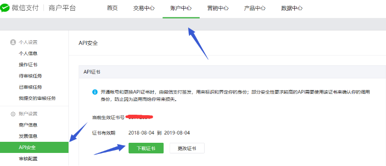 2.设置小程序提现设置,需要填写:apiclient_cert.pem ,apiclient_key.pem (支付根证书:新商户没有就不填写。)要填写的证书我们去哪里下载? 如下图: