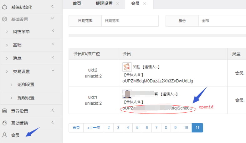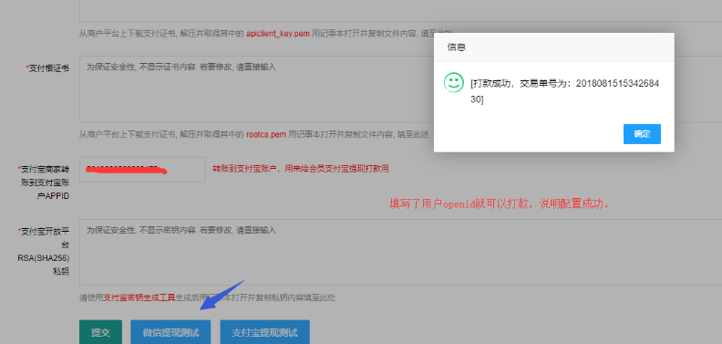 以上设置完以后记得提交保存。可以测试一下微信能否打款?首先我们的找到用户的openID。