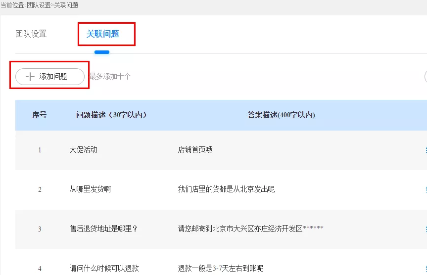 1、使用店铺主账号:进入咚咚设置——客服设置——自动回复,在关联问题中,增加店铺常见问题以及对应答案: