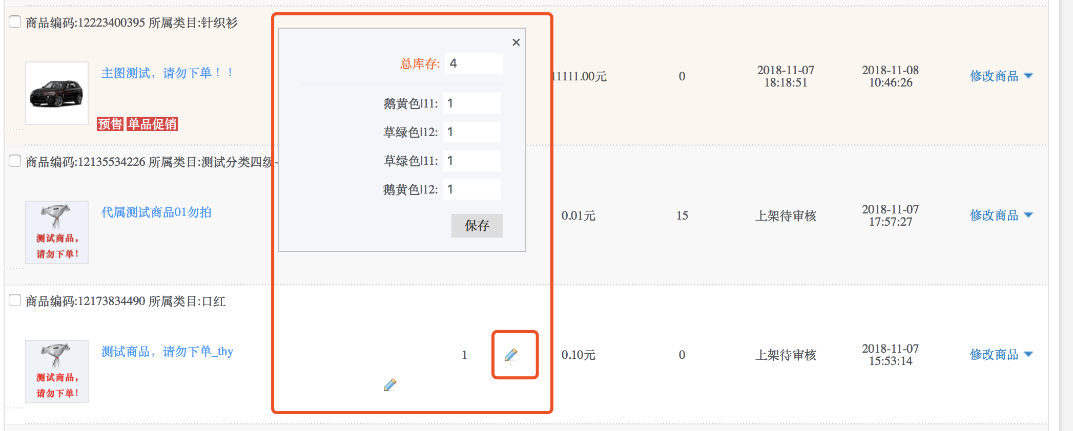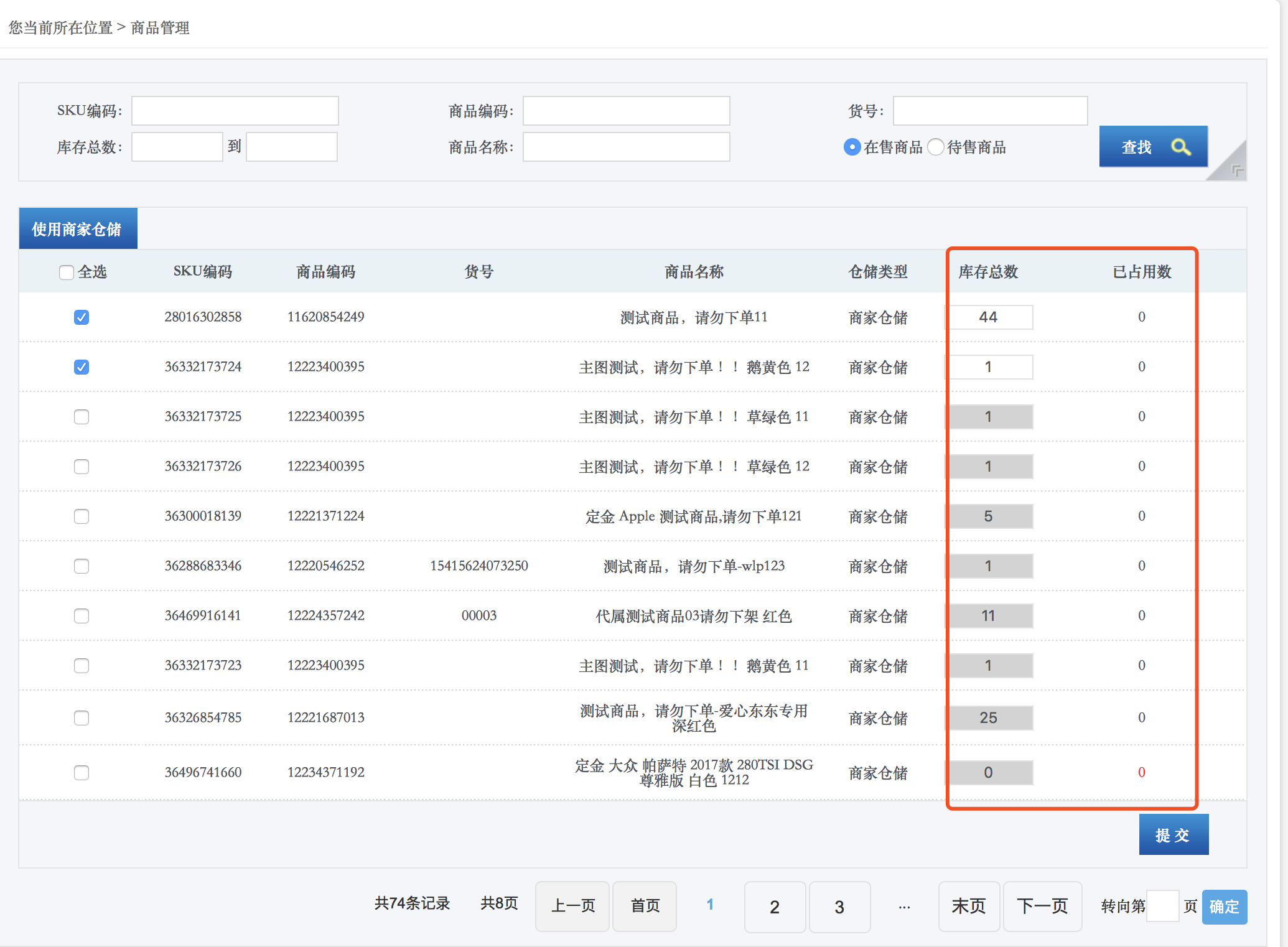 勾选sku,可修改库存总数,修改库存后,点击提交,提交成功后,总库存可修改成功