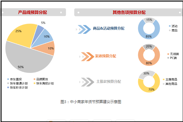 大促期间流量竞争激烈,建议推广类型以活动为主,建议预算占80%;渠道无线端流量明显大于PC端,所以在预算分配上建议PC端占80%,无线端可以适当减少20%;在推广商品分配上建议主推商品预算占70%,其他商品30%即可。