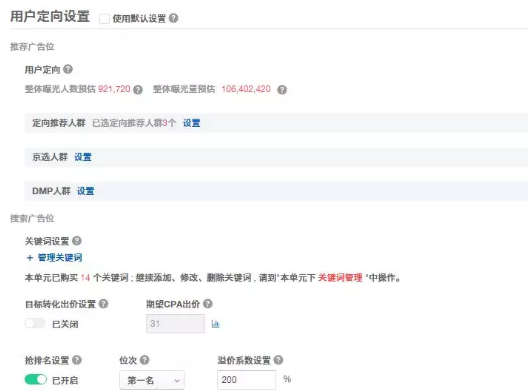 1、新建计划这里关闭了推荐位(推荐位本身展现高点击率低),仅保留搜索位。地域提前做了功课忽略一些展现少转化低的地区,见下图