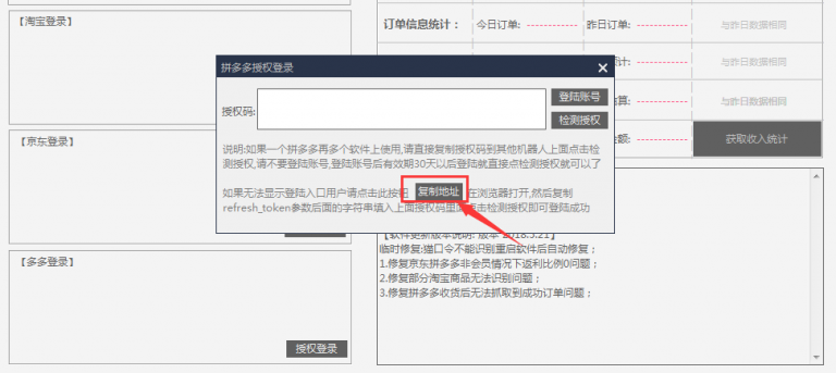 拼多多微信返利机器人登录不上的解决办法 如果出现登录拼多多的时候,窗口空白或者卡着登录不上情况,按照下图操作。 首先授权登录拼多多,点击复制地址,在浏览器打开,然后复制 refresh_token参数后面的字符串填写到这里授权码里面就行了。 登录拼多多会跳转到字符串页面,直接在网页上按住键盘Ctrl+F搜索关键词refresh_token 然后把引号的一整段复制到拼多多返利机器人里面,完成