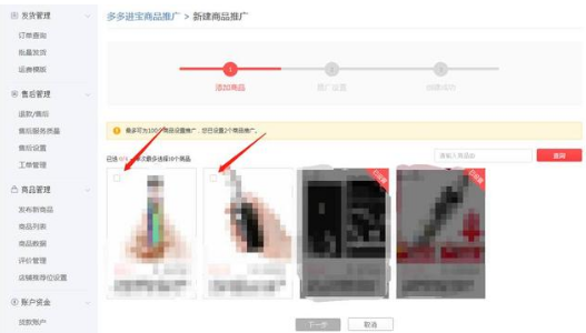 多多进宝可推广商品数量上限是100个,已经设置计划的商品,无法被再次选中,一次可以勾选多个商品,可以多个SKU一起推。