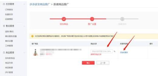 为了保证推广的效果,要求每一个商品的sku大于等于10元,必须设置优惠券,否则推广无法正常建立,这样的目的是为了吸引推手推广自己的商品,也是吸引买家购买。就是单独给要推的商品设置优惠券,之前的是统一的设置为隐藏的方式为:在商家后台-店铺推广-多多进宝这里,设置推广计划的时候,单独创建优惠券。