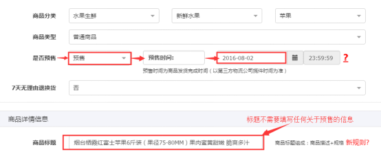 预售时间需设置到2016年8月2日,则可选择预售→预售时间→2016-08-02。