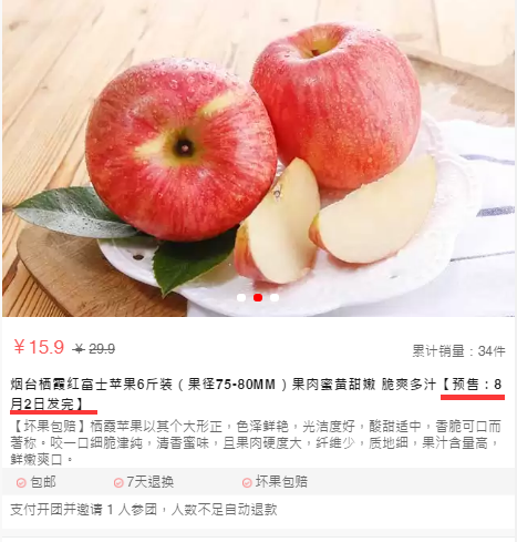 提交审核通过后,拼多多商城会自动给标题拼接:烟台栖霞红富士苹果6斤装(果径75-80MM)果肉蜜黄甜嫩 脆爽多汁【预售:8月2日发完】,如下图所示: