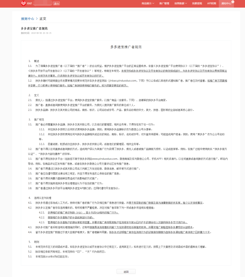 1.1. 为了保障多多进宝推广者(以下简称“推广者”)的合法权益,维护多多进宝推广平台的正常运营秩序,依据《多多进宝推广平台使用协议》(以下简称“多多进宝协议”)、《拼多多开放平台开发者协议》(以下简称“开发者协议”)等规定,特制定本规范。本规范构成多多进宝协议及开发者协议的有效组成部分,与多多进宝协议及开发者协议具有同等法律效力。本规范未涉事宜,应适用多多进宝协议或开发者协议的约定。