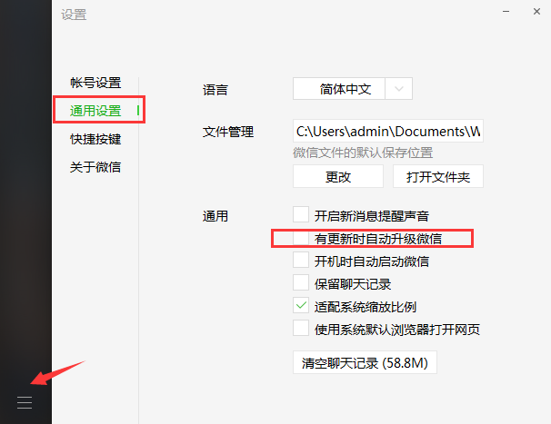 2.设置微信不自动更新版本(有更新时自动升级微信勾选去除!)