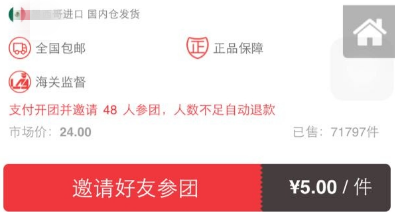 其次,如果你想购买的商品还没有人组团,那么你可以自己发起,你可以将拼团信息发到个人社交圈,邀请好友一起参团,这样更容易组团成功。注意,如果你开团24小时后无人来拼团,将会自动退款,最后,组团成功后,商品的发货时间也有所不同,根据商品的种类来划分。