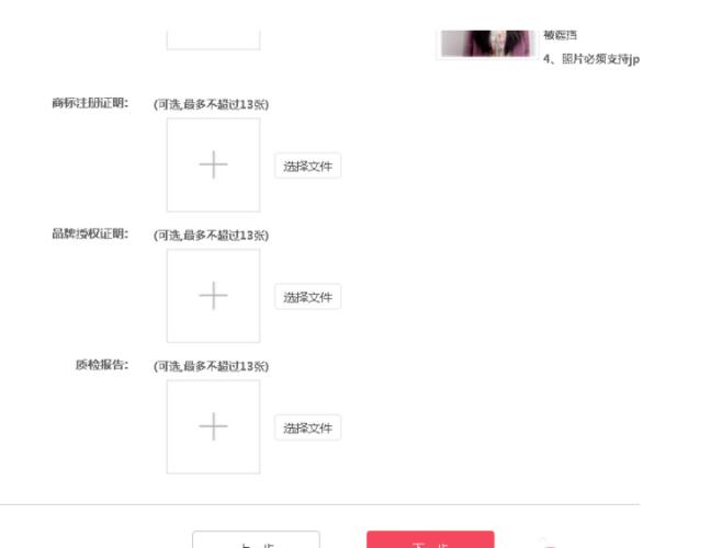4、如果说不是开企业店铺,或者开企业普通店铺,那么只需要上传营业执照和开户许可证这两个证件,至于商标之类的,如果你没有,那么就不选择即可。如果是个人店铺是不需要填写的。如下图所示: