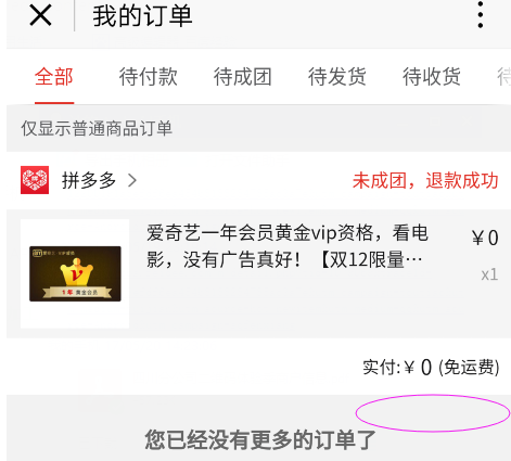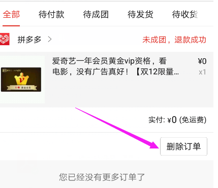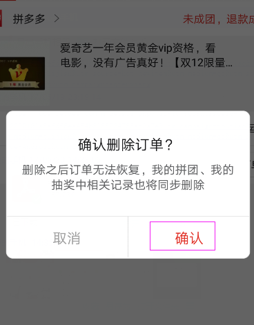 这里可删除的订单一般是完成交易或拼团、抽奖失败的,而进行中的单子暂不能删除;