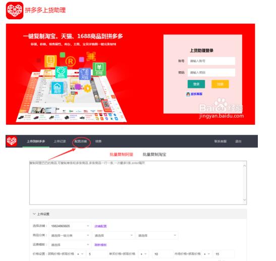 1、先找到拼多多上货助手,大家在百度里面直接搜索相关的软件即可,然后打开这个上货助理网页,需要大家进行注册登录,登录之后点击配置店铺,可配置多个拼多多店铺,如下图所示: