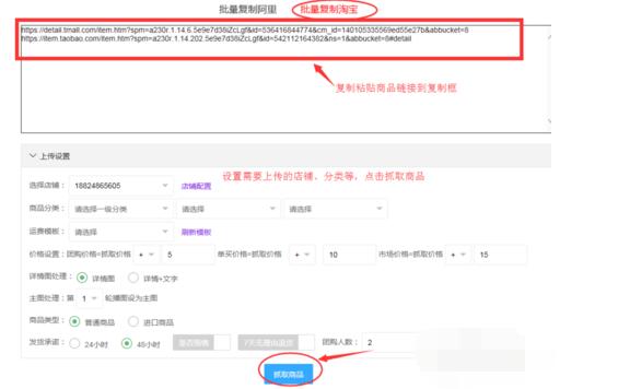 2、店铺配置设置好之后,大家就可以操作抓取商品,复制粘贴需要上传的商品链接,目前这个平台支持复制淘宝、天猫、1688商品到拼多多店,无需处理图片、销售属性图等,如下图所示: