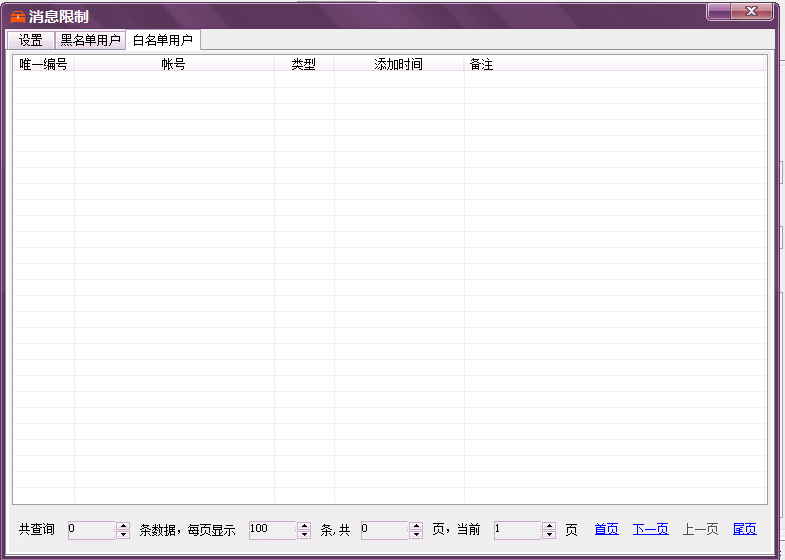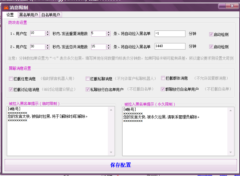 消息限制 主要用于屏蔽捣乱或者你不想他使用机器人的用户, 选项旁边都有功能描述。客户可在软件上看。这里就不描述了。 重点提示:需要将插件拖到第一位 才能起到消息拦截的功能。 插件执行顺序是从最上面开始的。 黑名单用户 白名单用户